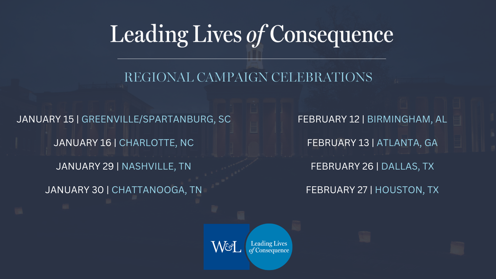The Leading Lives of Consequence campaign represents a powerful investment in Washington and Lee, and in our students and teachers, who contribute to and benefit from our educational excellence. The campaign is funding the critical priorities in W&L's Strategic Plan that will advance our mission. |