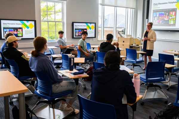 Assistant professor of business administration Emily Landry teaches class in the new Williams School building.
