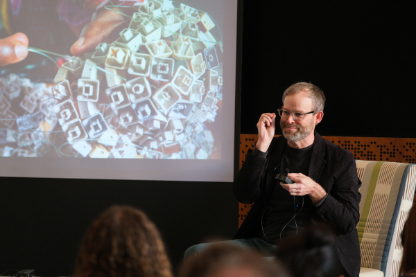 Associate professor of art Sandy de Lissovoy speaks about Moffat Takadiwa’s new exhibit, “Recorded Memories.” Photo by Bella Ferrate ’26