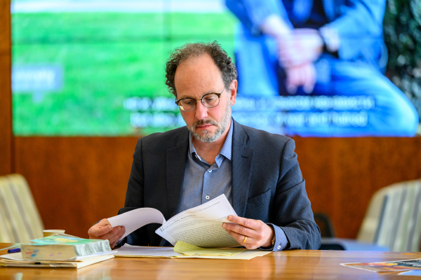 Professor of religion Jeff Kosky grades papers in the Ruscio Center for Global Learning.